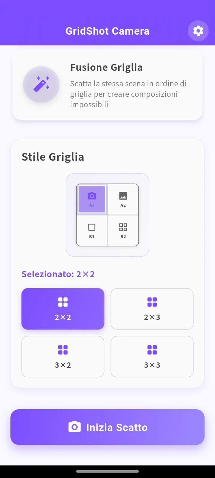 Fotografa con vari layout di griglia da 2×2 a 3×3. Massimizza la tua creatività.