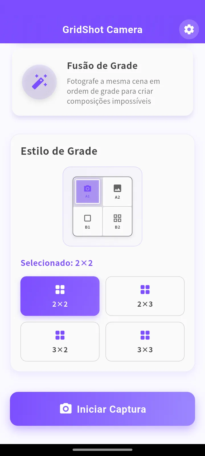 Fotografe com vários layouts de grade de 2×2 a 3×3. Maximize sua criatividade.
